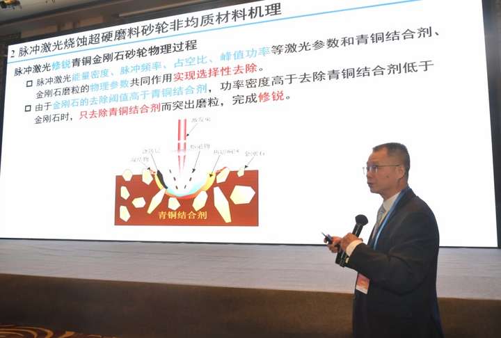 湖南大学教授陈根余分享了激光与机械协同修整金刚石轮的技术突破;